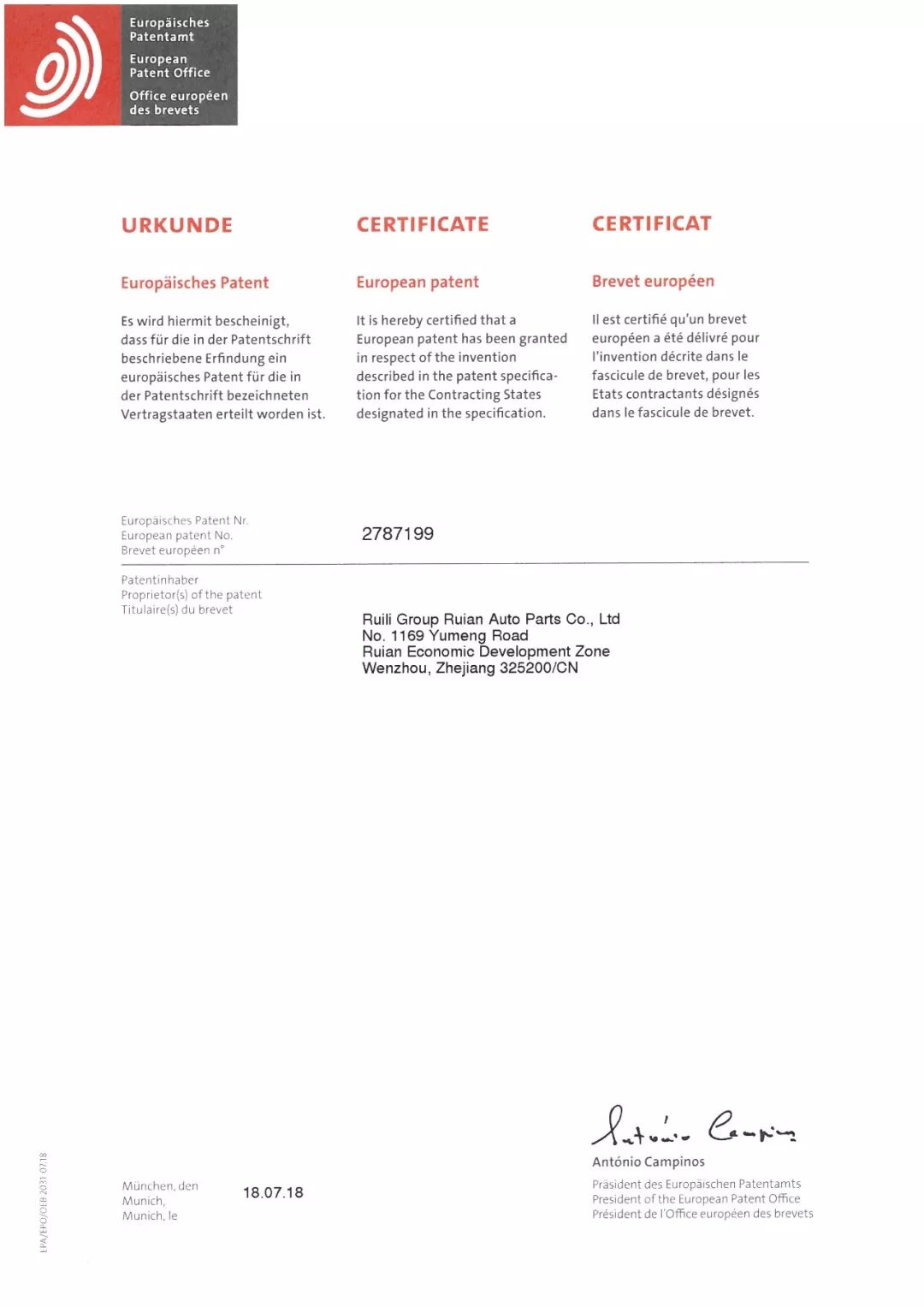 近日瑞立收到由歐洲專利局(EPO)頒發(fā)的發(fā)明專利證書。